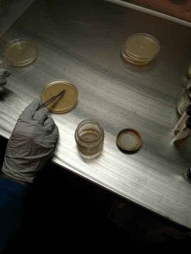 This is how a laminar flow machine works: through a porous wall at the back of the machine, air flows out and toward the person sitting in front of it, ideally blowing away potential contaminants. This allows one to get in and out of the petri dishes with as little contamination as possible. However, for maximal efficacy, one must avoid creating turbulence. (This could cause things-in-the-air to get into the petri dishes).